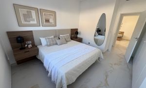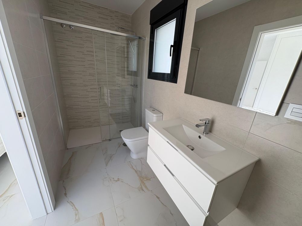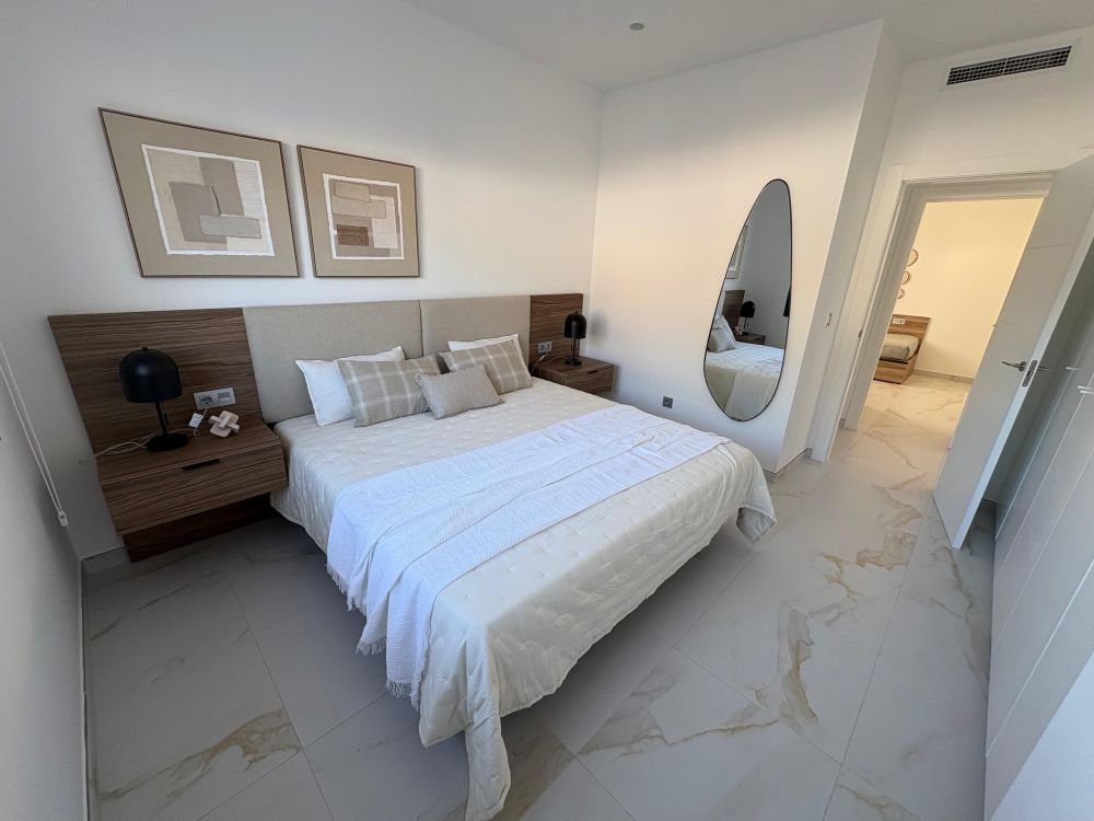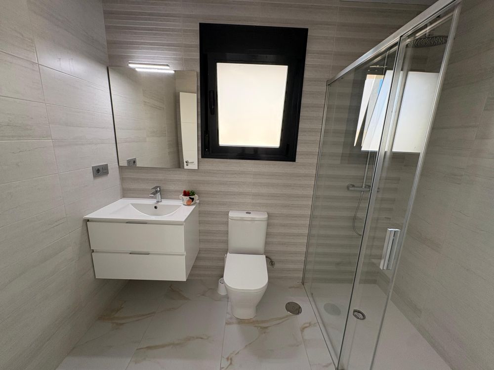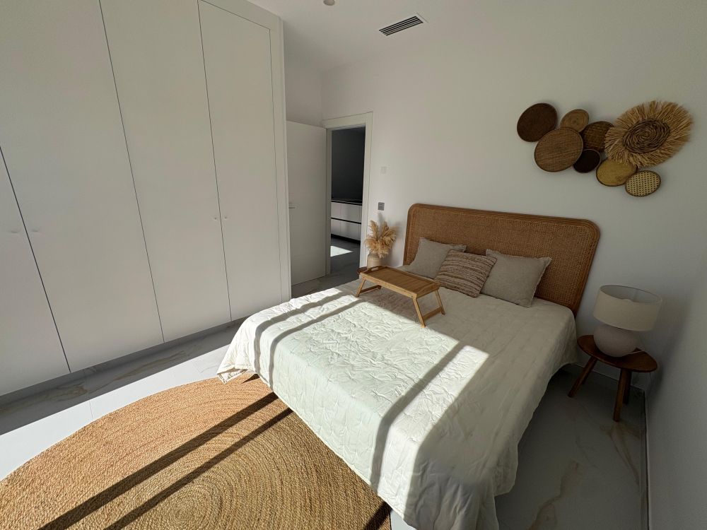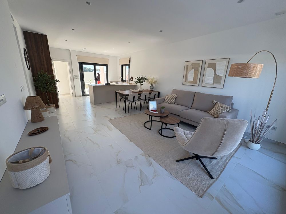 La vivienda, de diseño contemporáneo y líneas elegantes, ofrece 3 amplios dormitorios, 2 baños completos, y un luminoso salón con cocina abierta, creando un espacio funcional y acogedor con acceso directo al exterior.