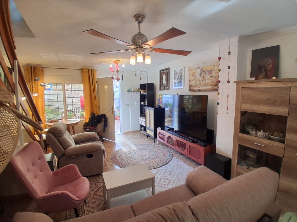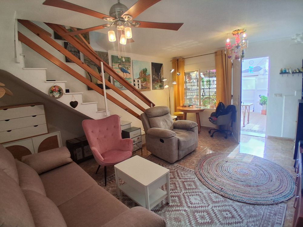 La vivienda cuenta con aproximadamente 70 m² construidos distribuidos en dos plantas. En la planta baja encontramos un salón luminoso, una cocina independiente y acceso directo a una amplia terraza delantera, perfecta para disfrutar del aire libre durante todo el año. En la planta alta se ubican dos dormitorios bien distribuidos y un baño completo. Además, la propiedad dispone de un solárium privado que ofrece un espacio extra ideal para relajarse, tomar el sol o crear una zona chill out personalizada.